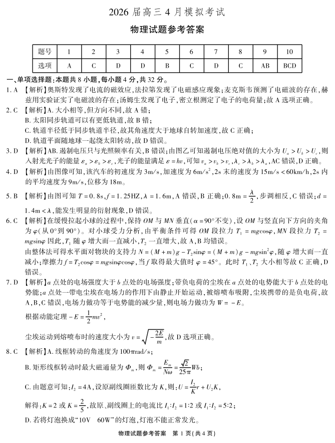 高三物理答案--安徽省江淮十校2026届高三下学期4月模拟考试(安庆市高三三模)