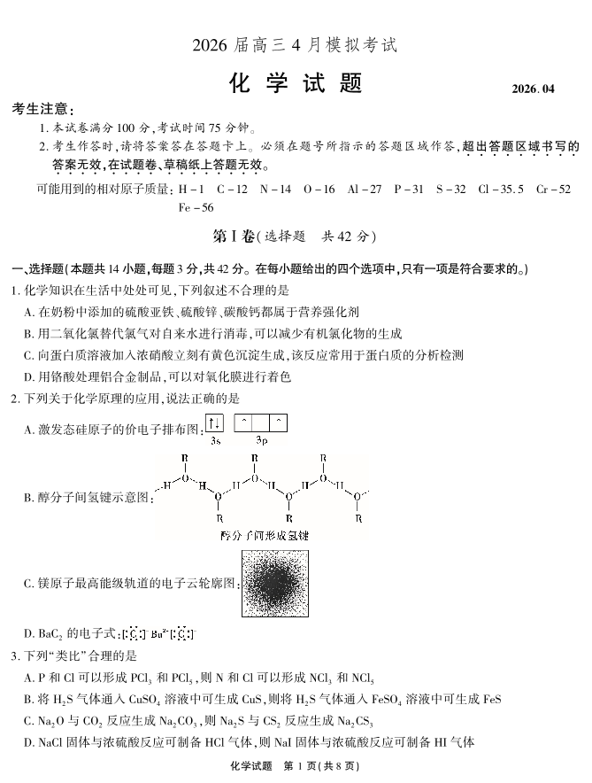 高三化学--安徽省江淮十校2026届高三下学期4月模拟考试(安庆市高三三模)