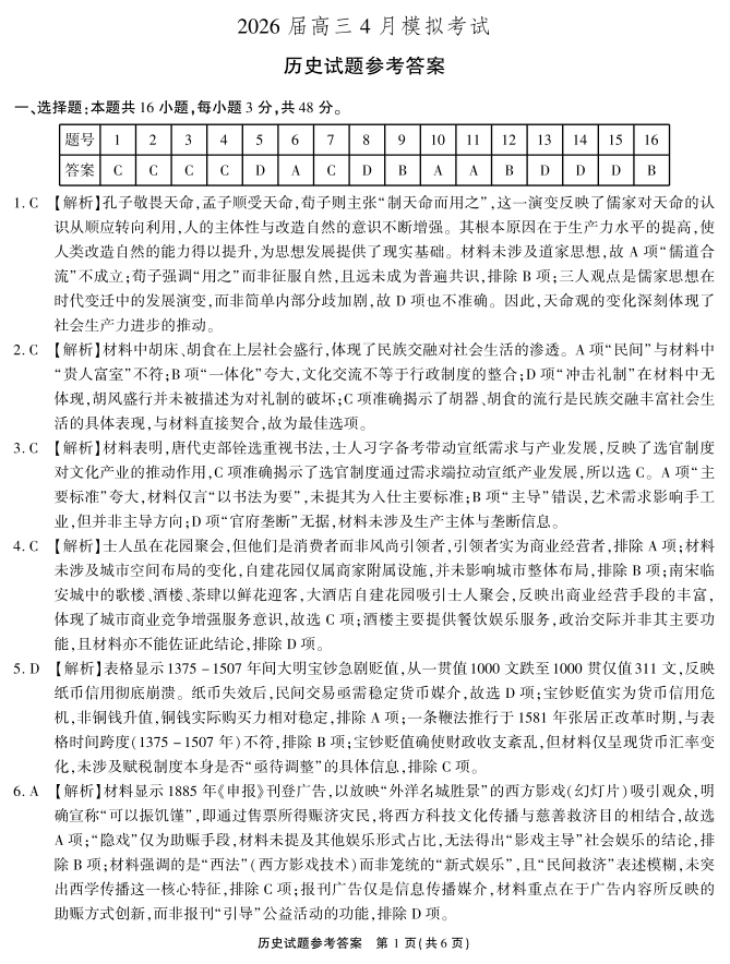 高三历史答案--安徽省江淮十校2026届高三下学期4月模拟考试(安庆市高三三模)