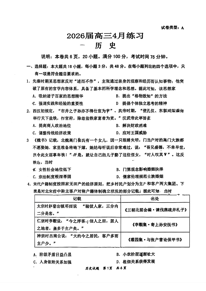 高三历史--广东省惠州市、韶关市2026届高三下学期4月模拟考试