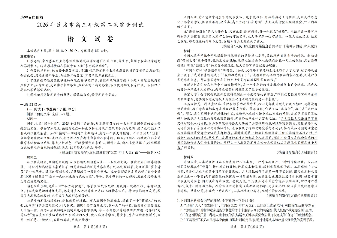 高三语文--广东省茂名市2026届高三第二次综合测试(茂名二模)