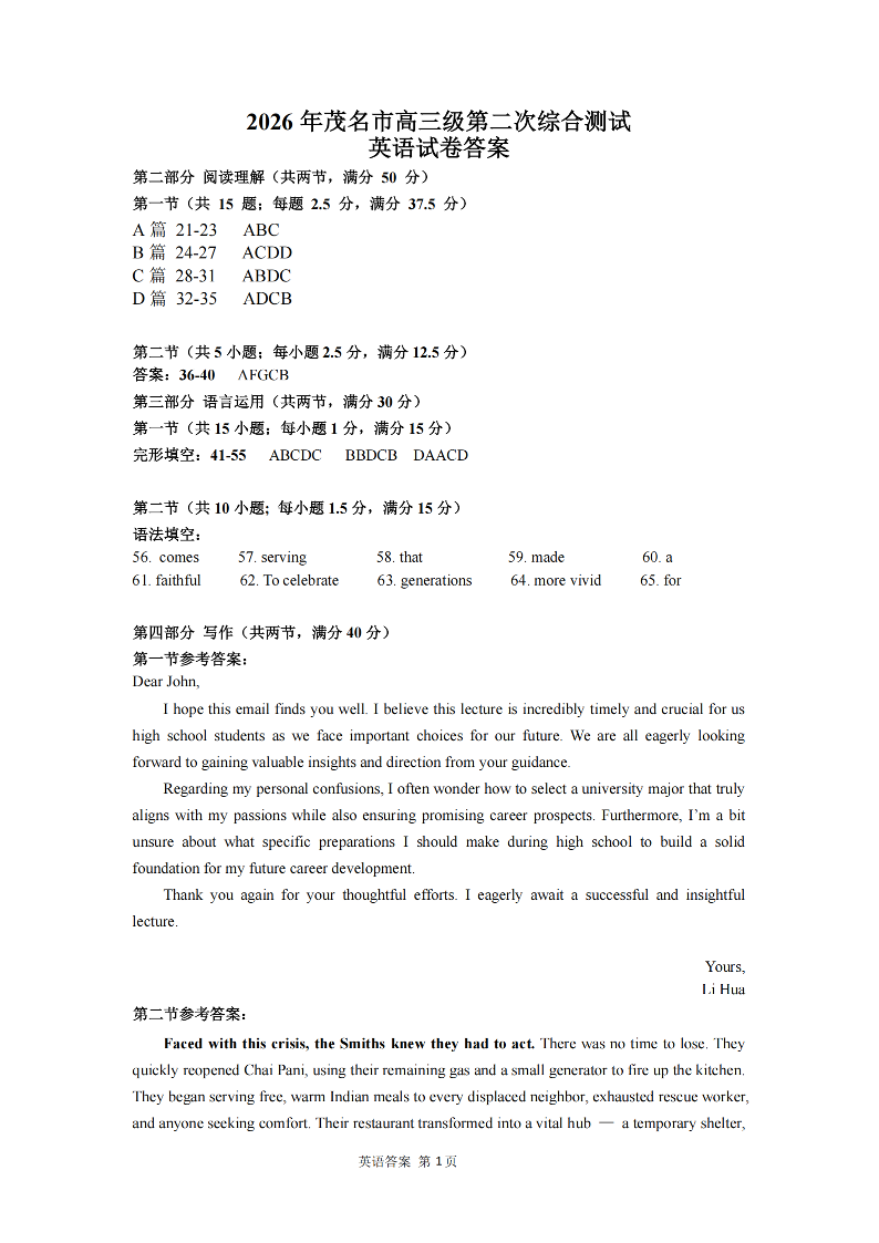 高三英语答案--广东省茂名市2026届高三第二次综合测试(茂名二模)
