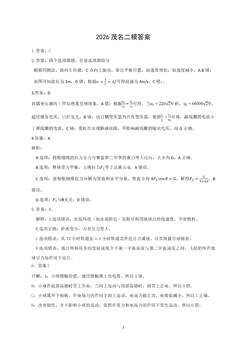高三物理答案--广东省茂名市2026届高三第二次综合测试(茂名二模)