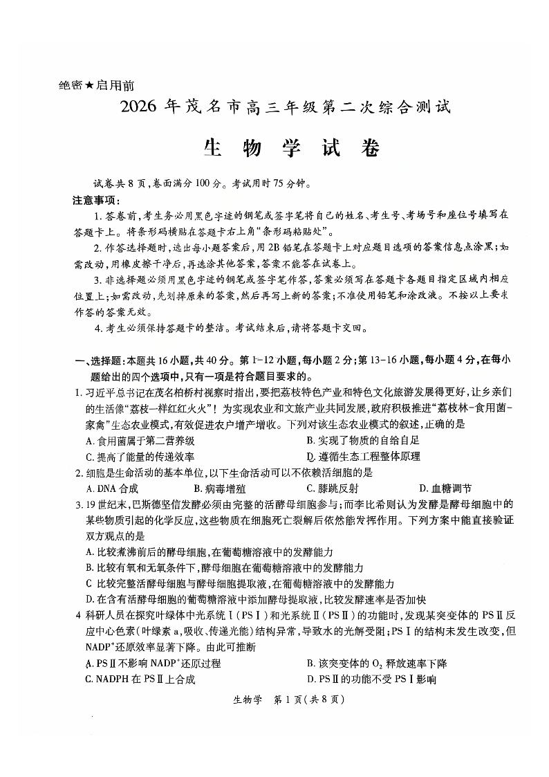 高三生物--广东省茂名市2026届高三第二次综合测试(茂名二模)