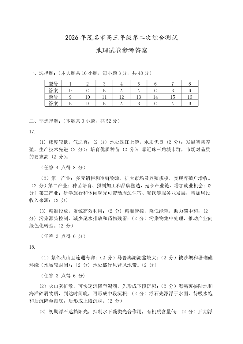 高三地理答案--广东省茂名市2026届高三第二次综合测试(茂名二模)