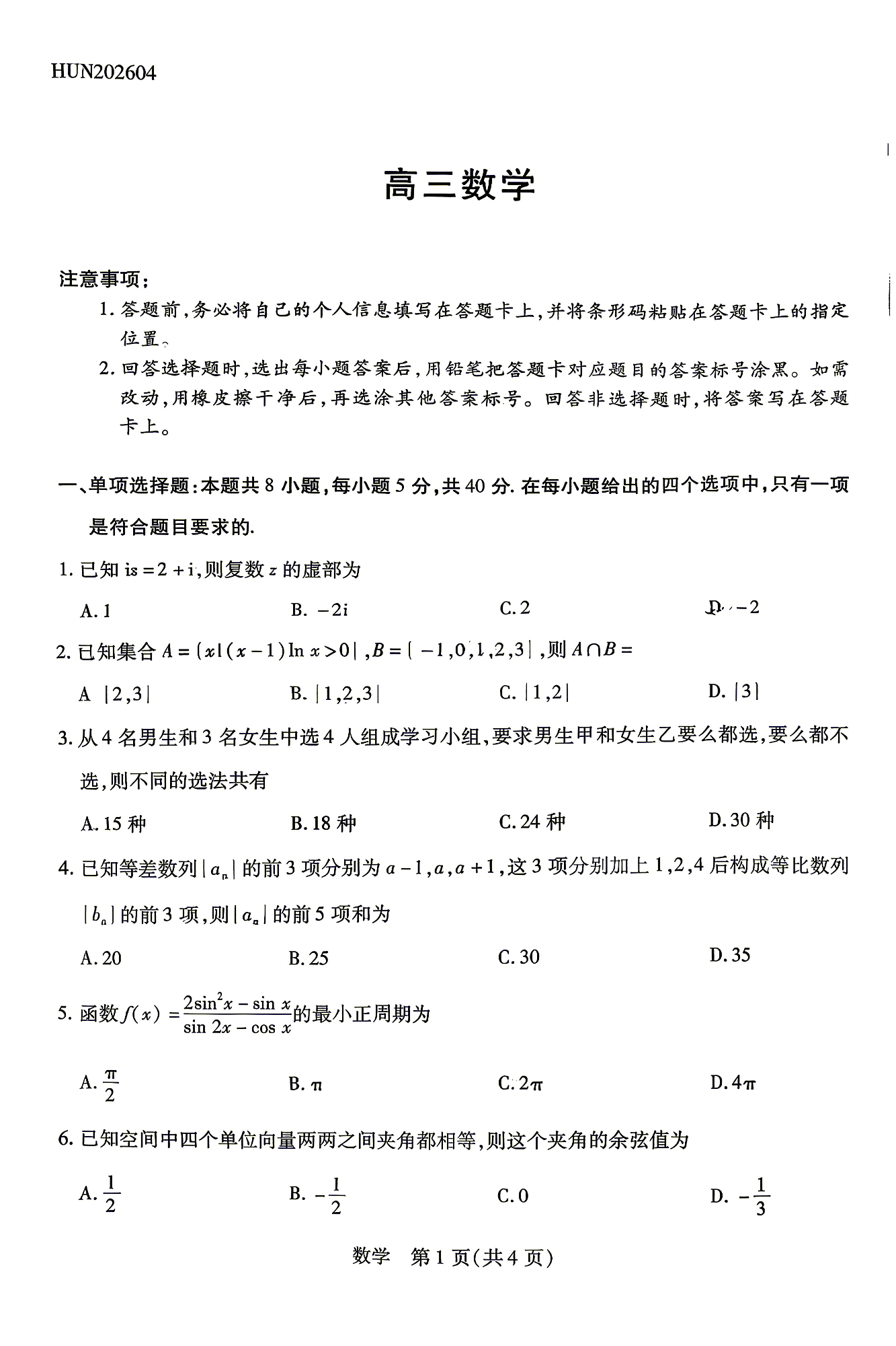 高三数学--湖南省、广西壮族自治区天一大联考2026届高三4月大联考