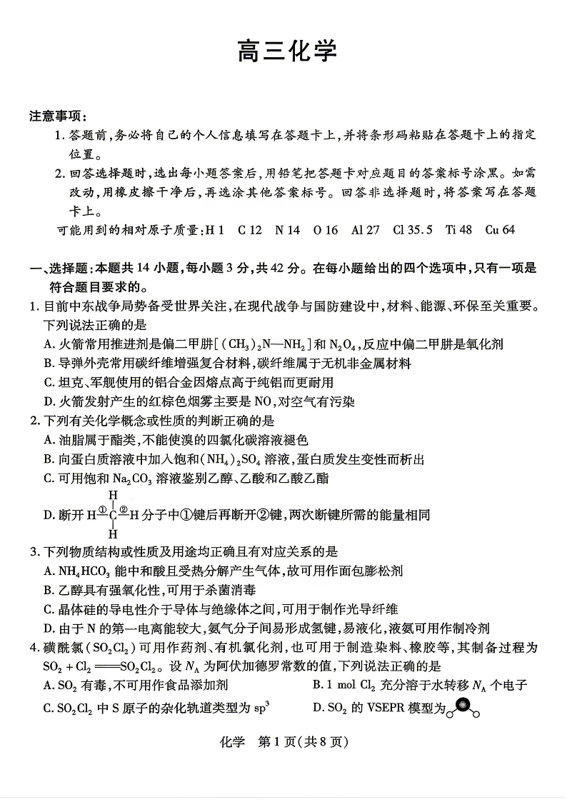 高三化学+答案--湖南省、广西壮族自治区天一大联考2026届高三4月大联考