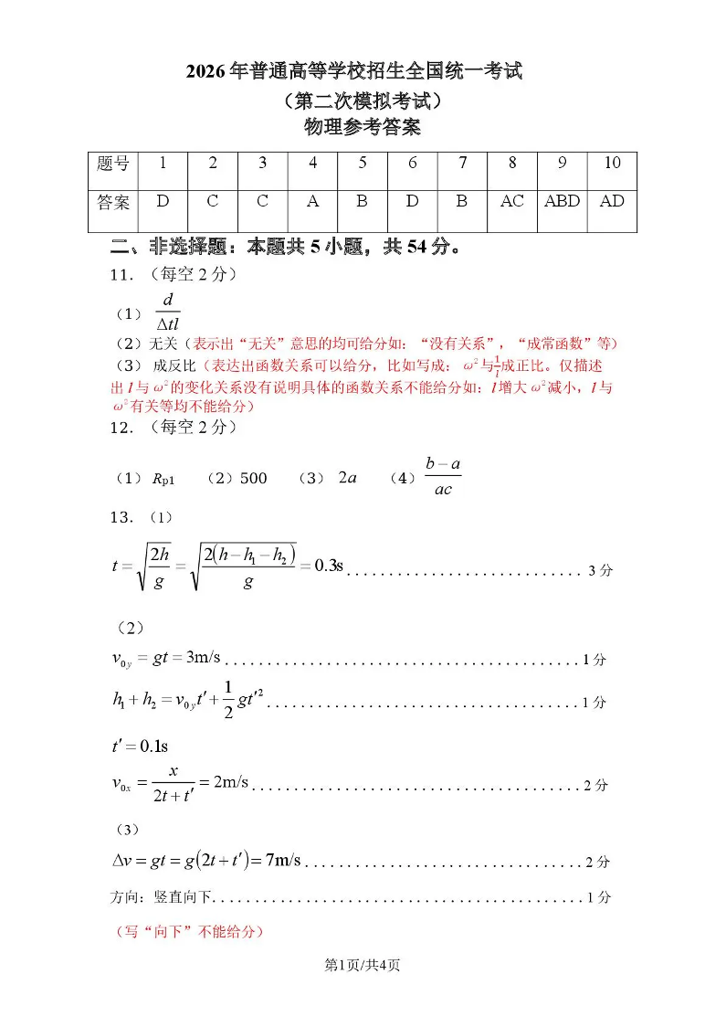 高三物理答案--内蒙古包头市2026届高三下学期二模考试(包头二模)