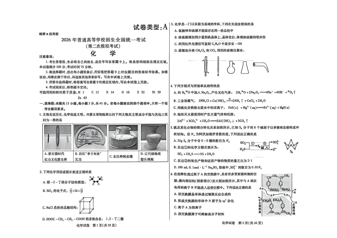 高三化学--内蒙古包头市2026届高三下学期二模考试(包头二模)