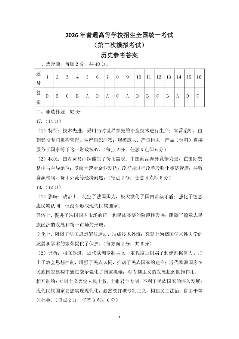 高三历史答案--内蒙古包头市2026届高三下学期二模考试(包头二模)