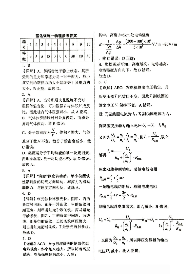 高三物理答案--重庆市第八中学2026届高三强化训练(一)