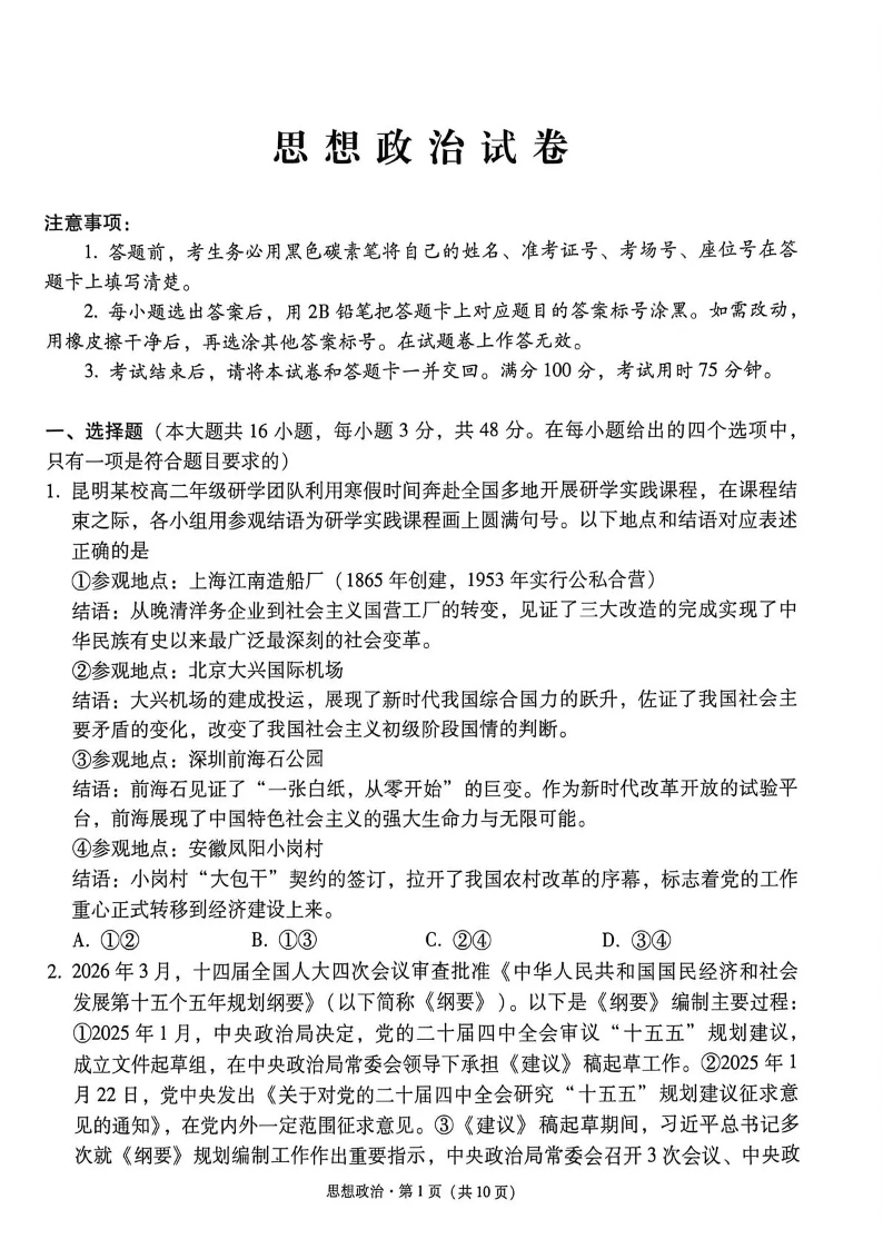 高三政治--云南省3+3+3西南名校联盟2026届高三4月联考