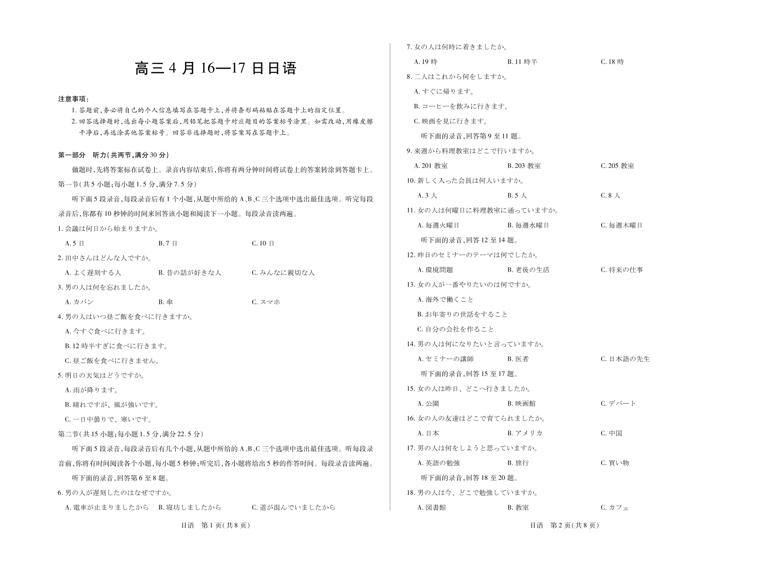 高三日语--安徽省合肥市第六中学等学校2026届高三4月联考