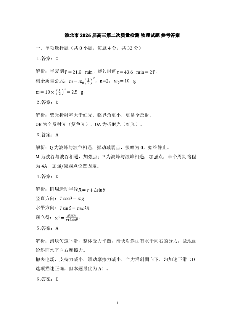 高三物理答案--安徽省淮北市2026届高三下学期第二次质量检测(淮北二模)