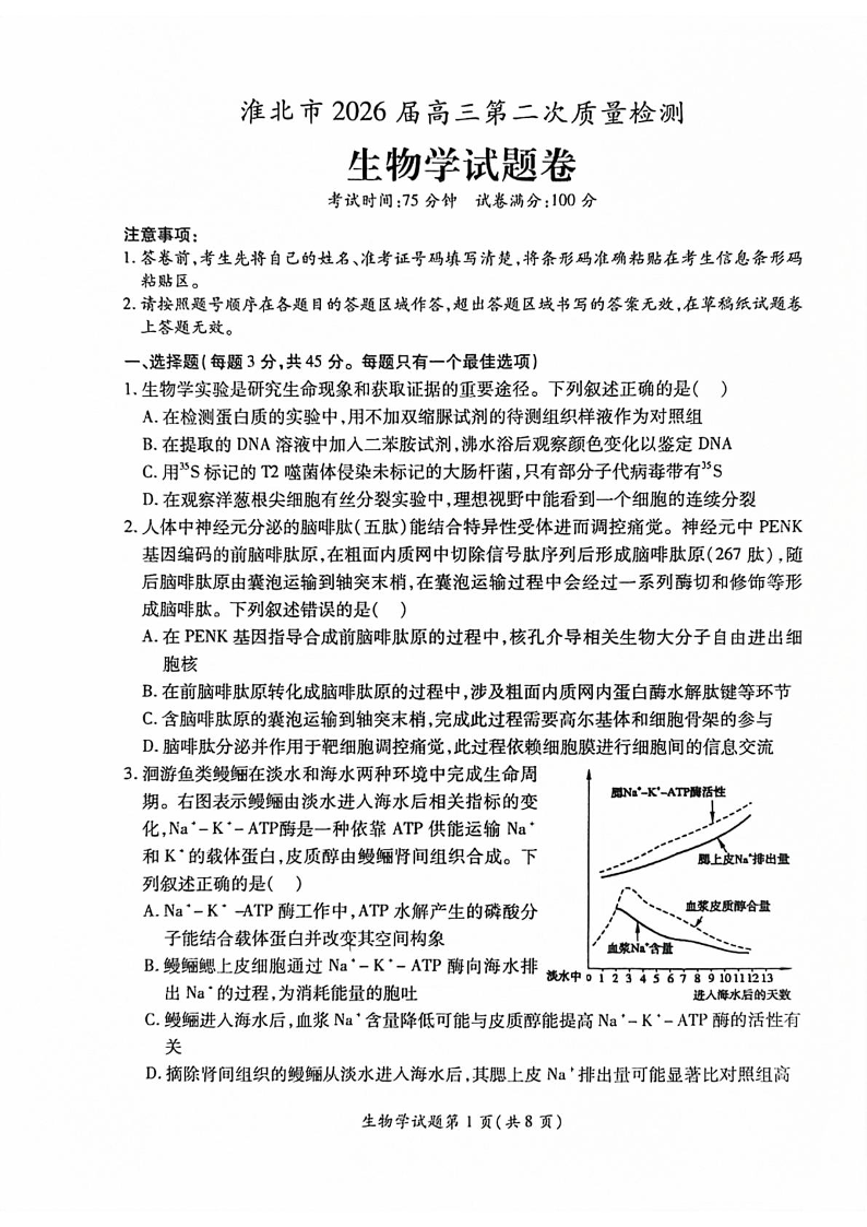 高三生物--安徽省淮北市2026届高三下学期第二次质量检测(淮北二模)