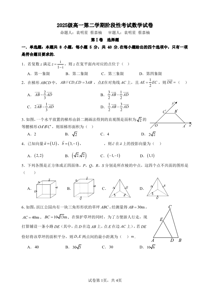 高一数学--广东省汕头市金山中学2025-2026学年高一下学期4月阶段性考试
