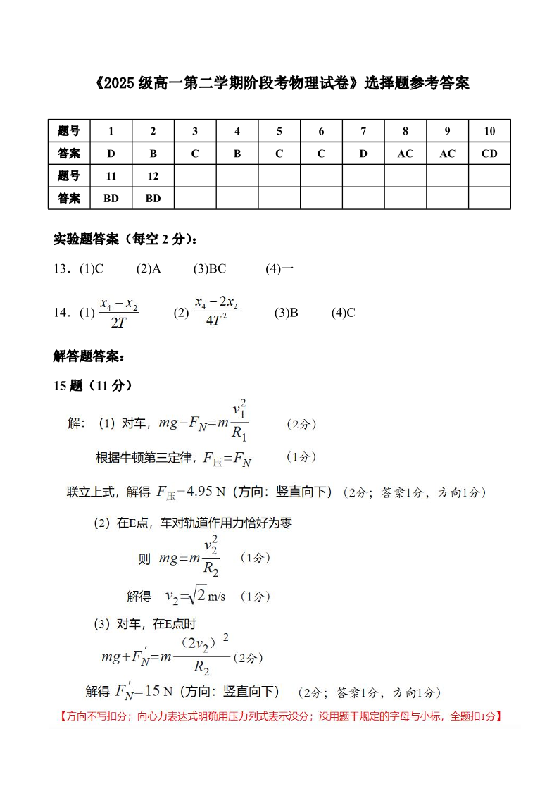 高一物理答案--广东省汕头市金山中学2025-2026学年高一下学期4月阶段性考试