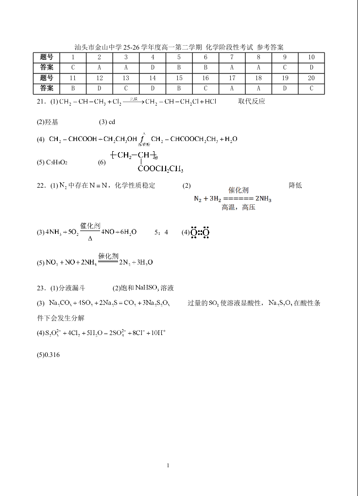 高一化学答案--广东省汕头市金山中学2025-2026学年高一下学期4月阶段性考试