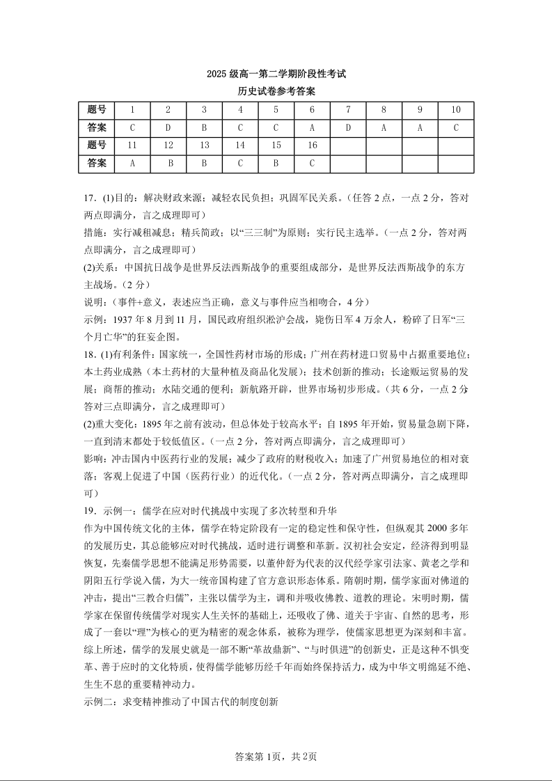 高一历史答案--广东省汕头市金山中学2025-2026学年高一下学期4月阶段性考试