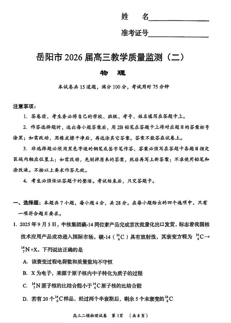 高三物理--湖南省岳阳市2026届高三4月教学质量监测(二)(岳阳二模)