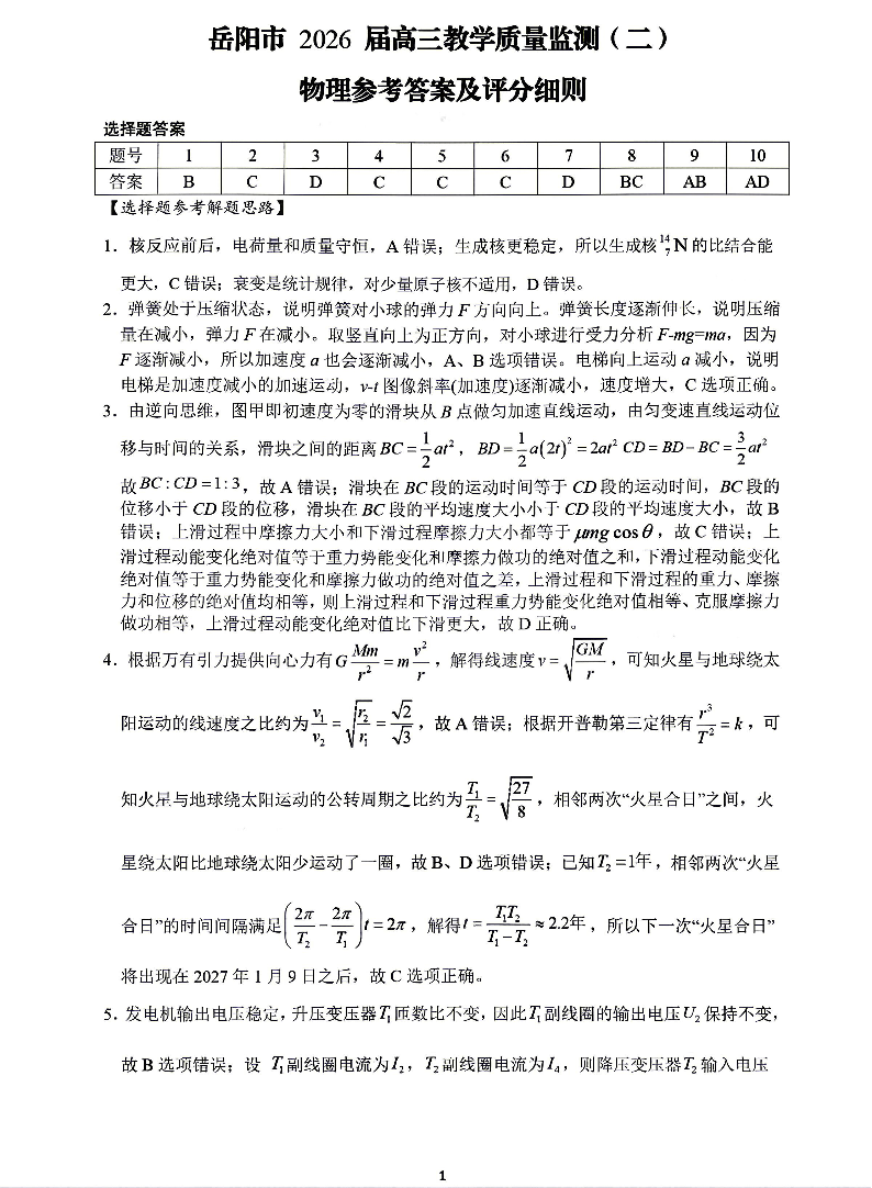 高三物理答案--湖南省岳阳市2026届高三4月教学质量监测(二)(岳阳二模)
