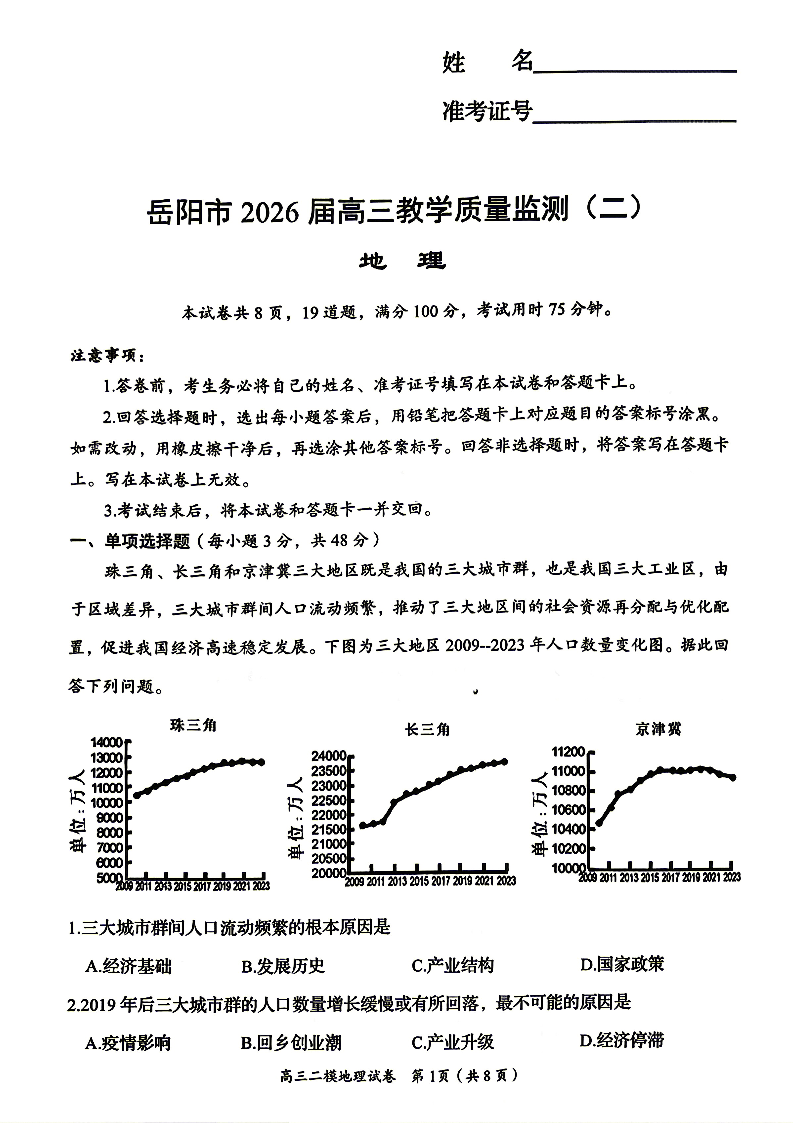高三地理--湖南省岳阳市2026届高三4月教学质量监测(二)(岳阳二模)