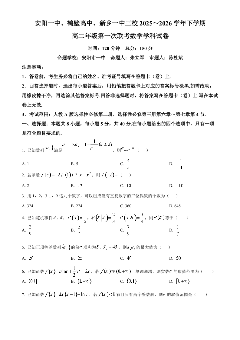 高二数学--河南省安阳一中、鹤壁高中、新乡一中三校2025~2026学年下学期高二年级第一次联考