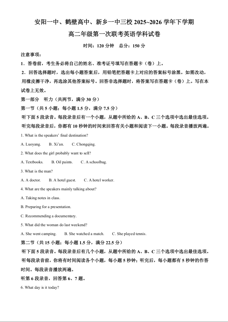 高二英语答案--河南省安阳一中、鹤壁高中、新乡一中三校2025~2026学年下学期高二年级第一次联考