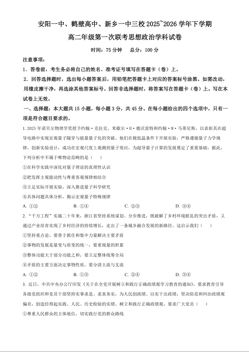 高二政治--河南省安阳一中、鹤壁高中、新乡一中三校2025~2026学年下学期高二年级第一次联考