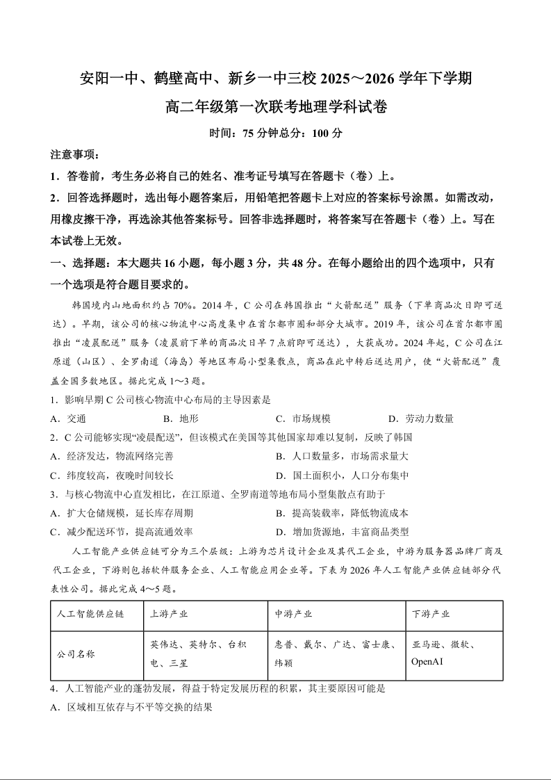高二地理--河南省安阳一中、鹤壁高中、新乡一中三校2025~2026学年下学期高二年级第一次联考