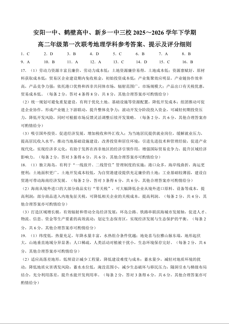 高二地理答案--河南省安阳一中、鹤壁高中、新乡一中三校2025~2026学年下学期高二年级第一次联考