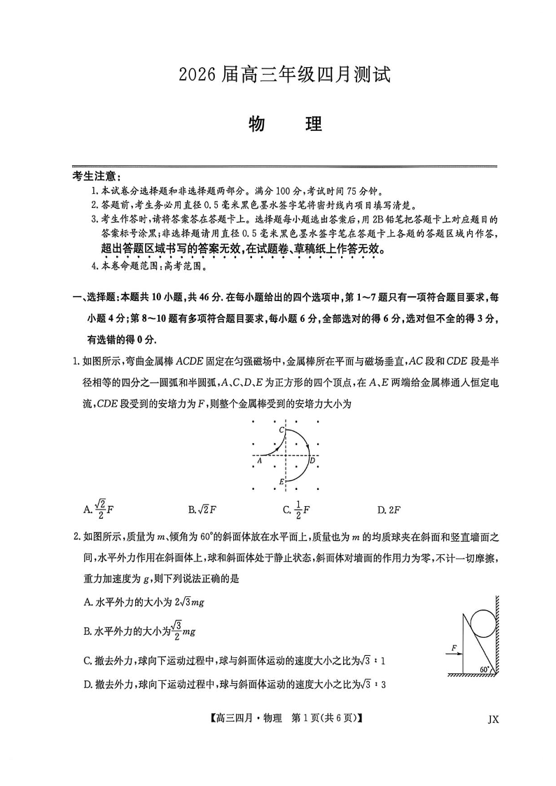 高三物理--九师联盟2026届高三年级下学期4月测试