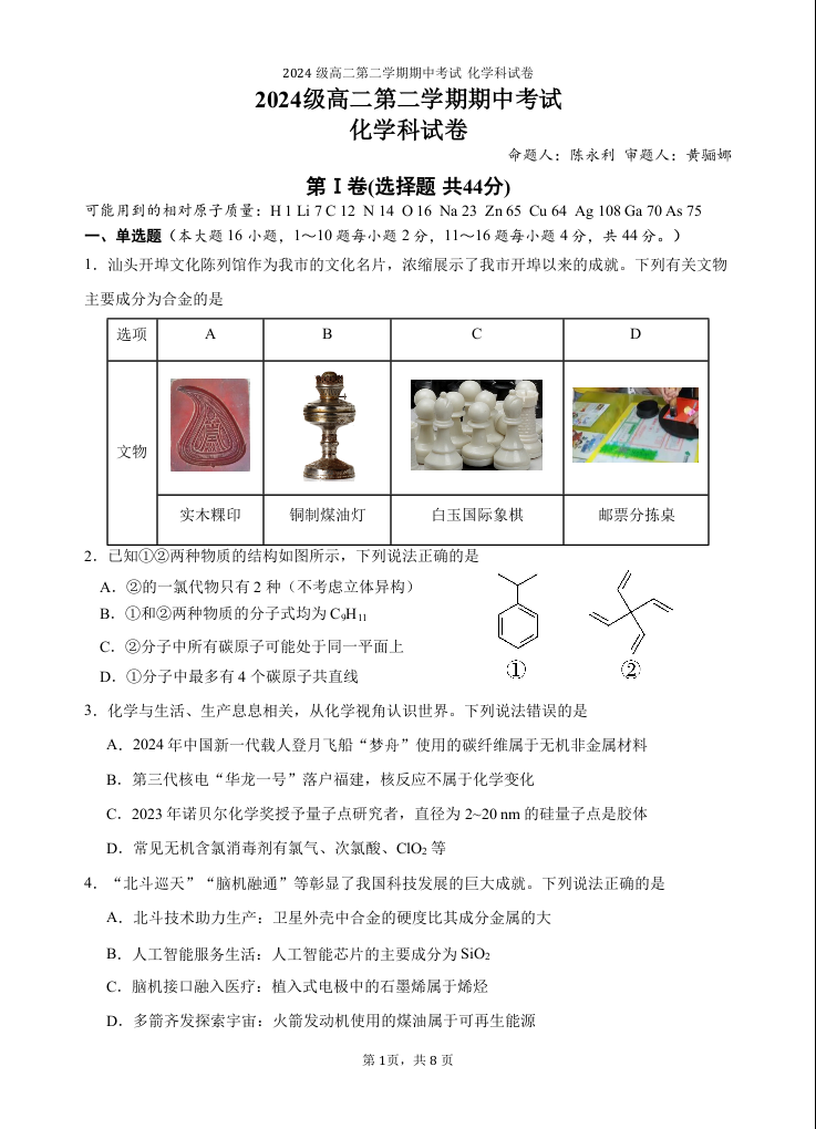 高二化学--广东省汕头市金山中学2025-2026学年高二下学期期中考试