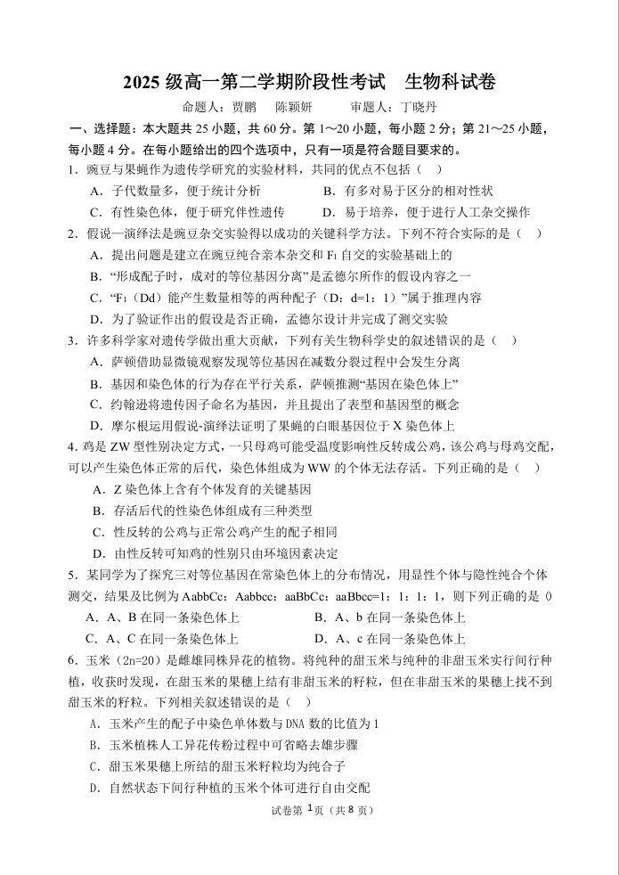 高二生物--广东省汕头市金山中学2025-2026学年高二下学期期中考试