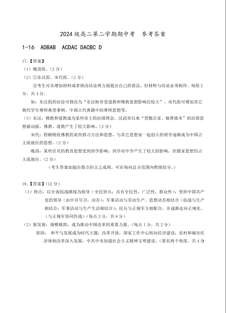 高二历史答案--广东省汕头市金山中学2025-2026学年高二下学期期中考试
