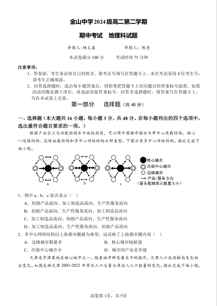 高二地理--广东省汕头市金山中学2025-2026学年高二下学期期中考试