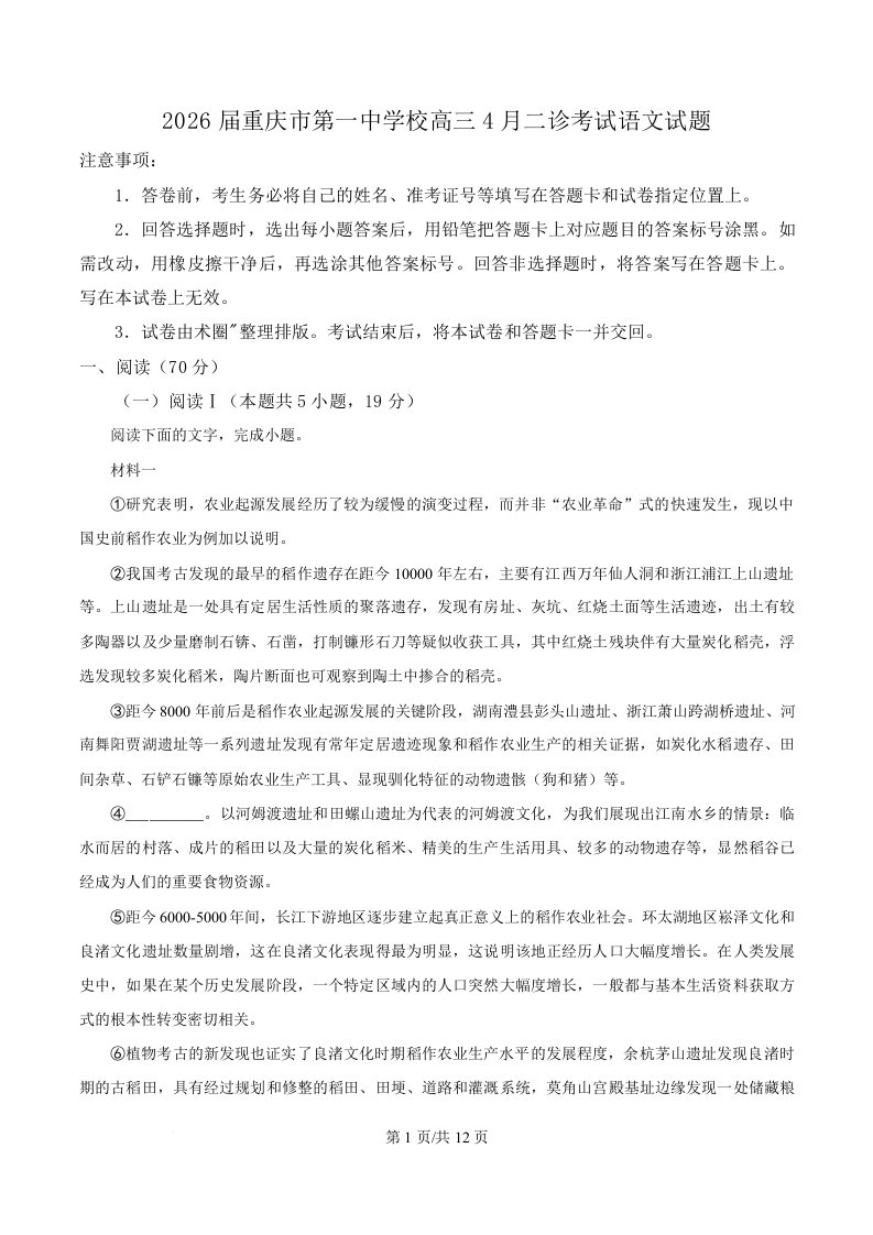 高三语文(原卷版)--重庆市第一中学2026届高三4月二诊考试