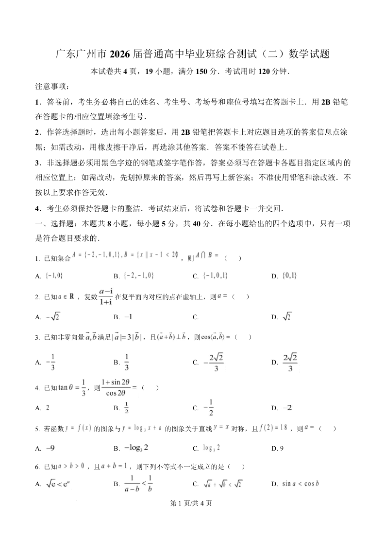 高三数学(原卷版)--广东省广州市2026届普通高中毕业班综合测试(二)(广州二模)