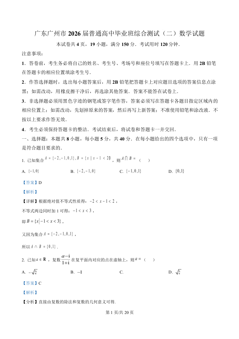 高三数学(精品解析版)--广东省广州市2026届普通高中毕业班综合测试(二)(广州二模)