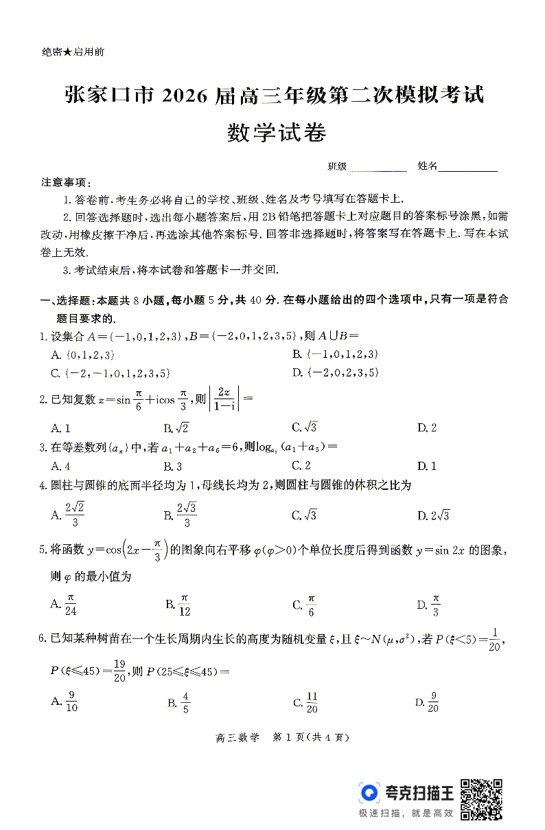 高三数学--河北省张家口市2026届高三第二次模拟考试(张家口二模)