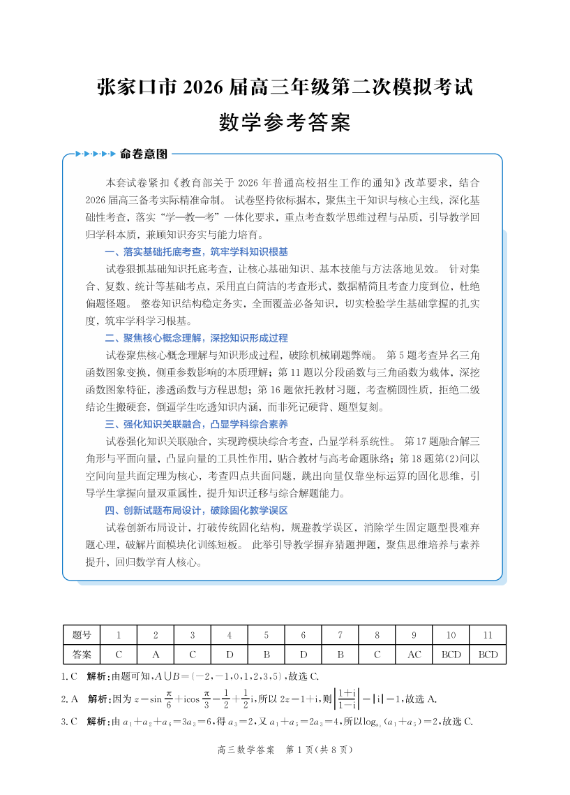 高三数学答案--河北省张家口市2026届高三第二次模拟考试(张家口二模)