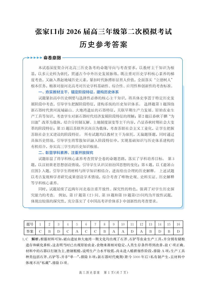 高三历史答案--河北省张家口市2026届高三第二次模拟考试(张家口二模)