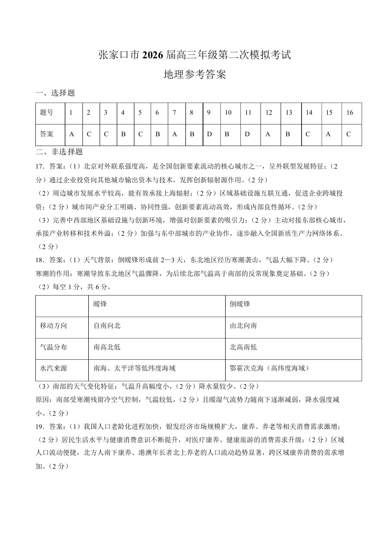 高三地理答案--河北省张家口市2026届高三第二次模拟考试(张家口二模)
