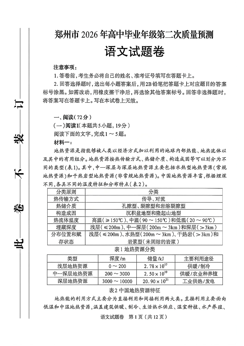 高三语文--河南省郑州市 2026 届高三第二次质量预测(郑州二模)