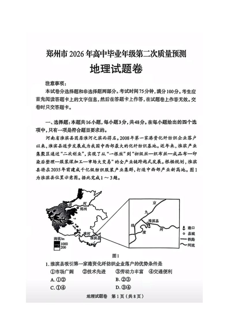 高三地理+答案--河南省郑州市 2026 届高三第二次质量预测(郑州二模)