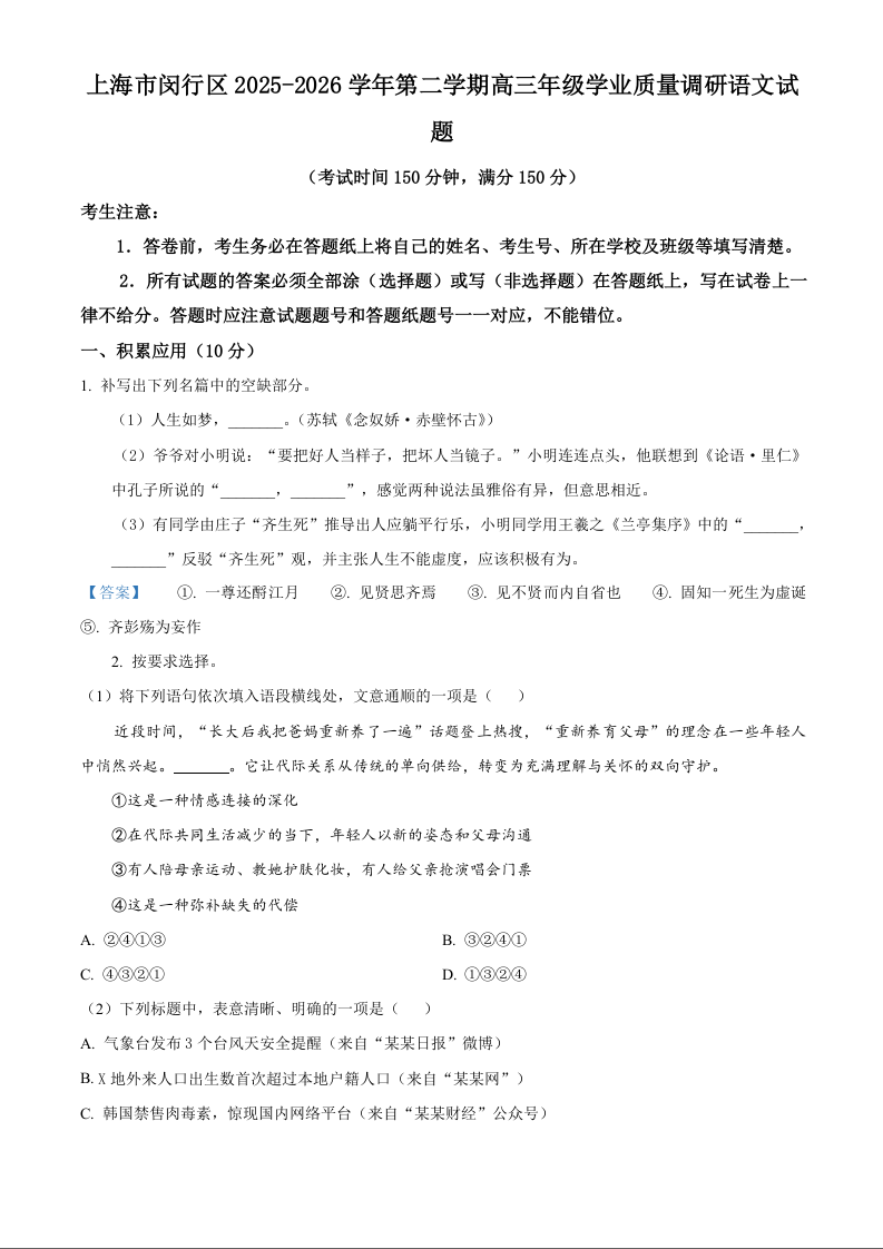 高三语文(解析版)--上海市闵行区2026届高三下学期二模