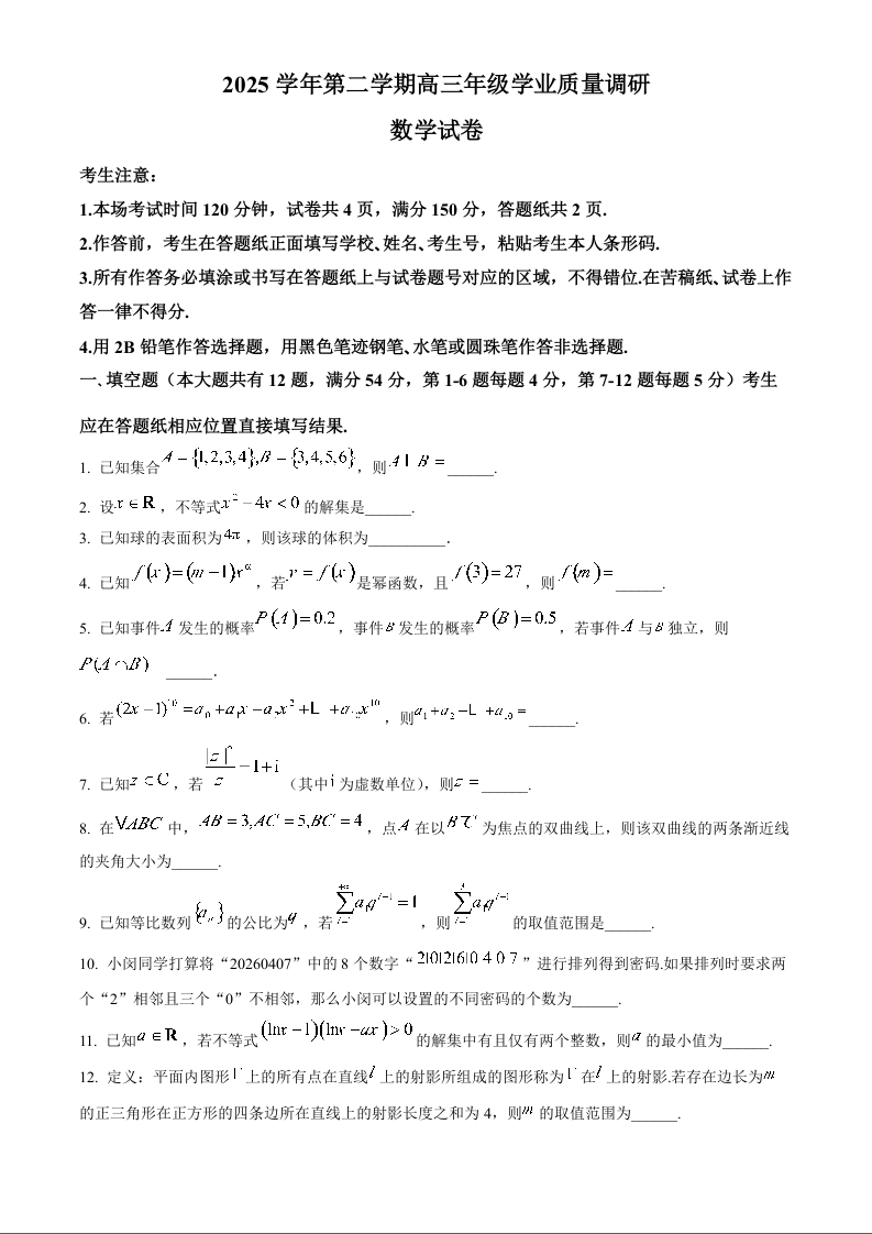 高三数学(原卷版)--上海市闵行区2026届高三下学期二模