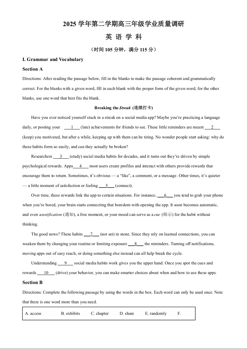 高三英语(原卷版)--上海市闵行区2026届高三下学期二模