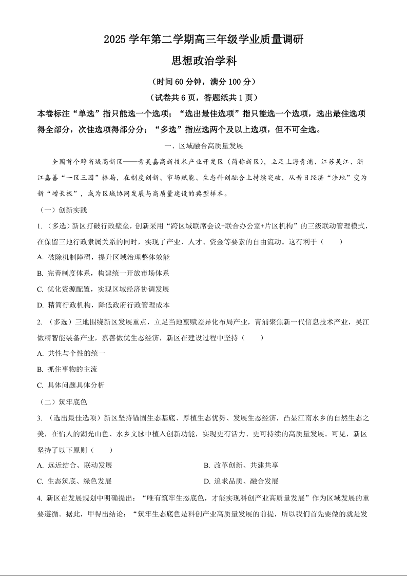 高三政治(解析版)--上海市闵行区2026届高三下学期二模