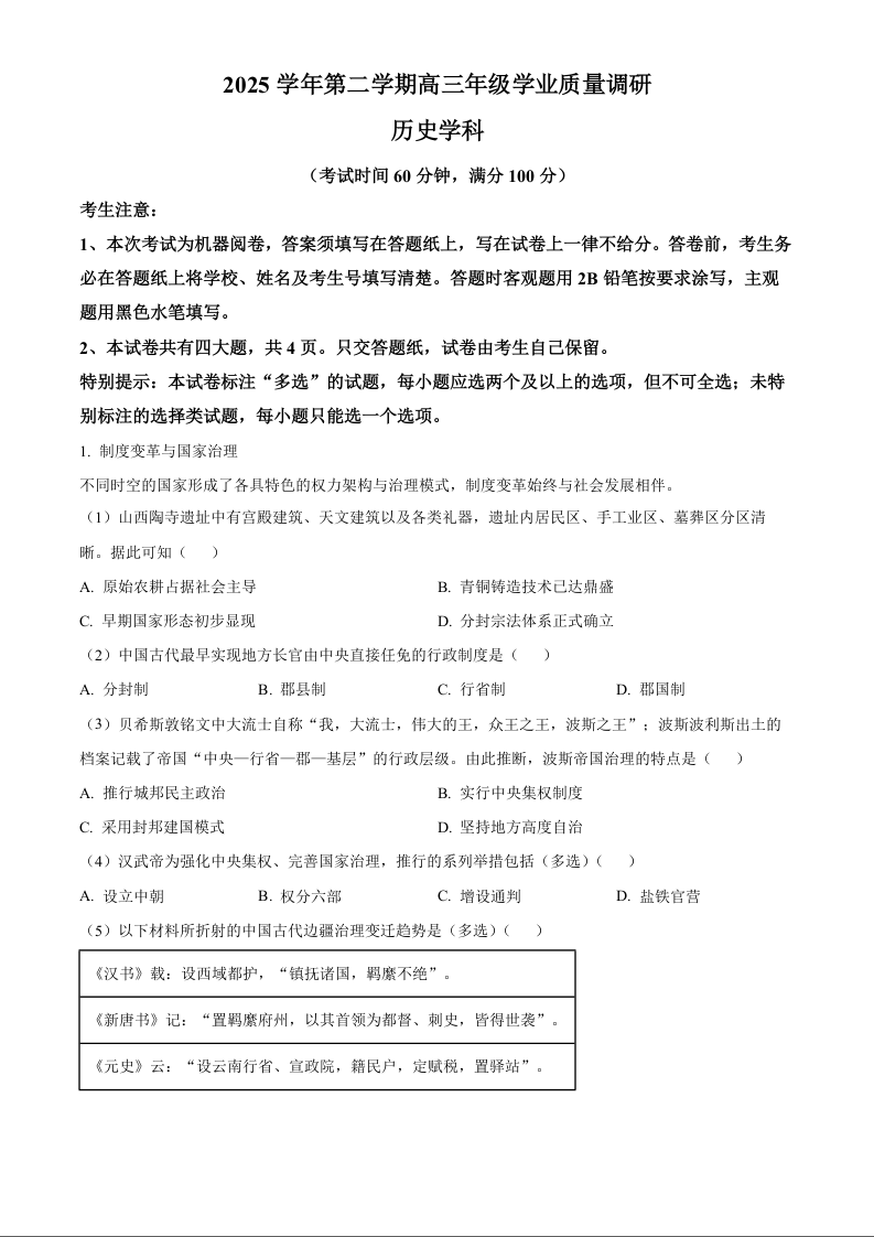 高三历史(解析版)--上海市闵行区2026届高三下学期二模